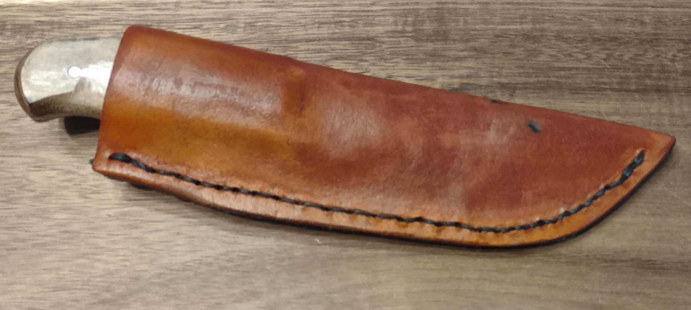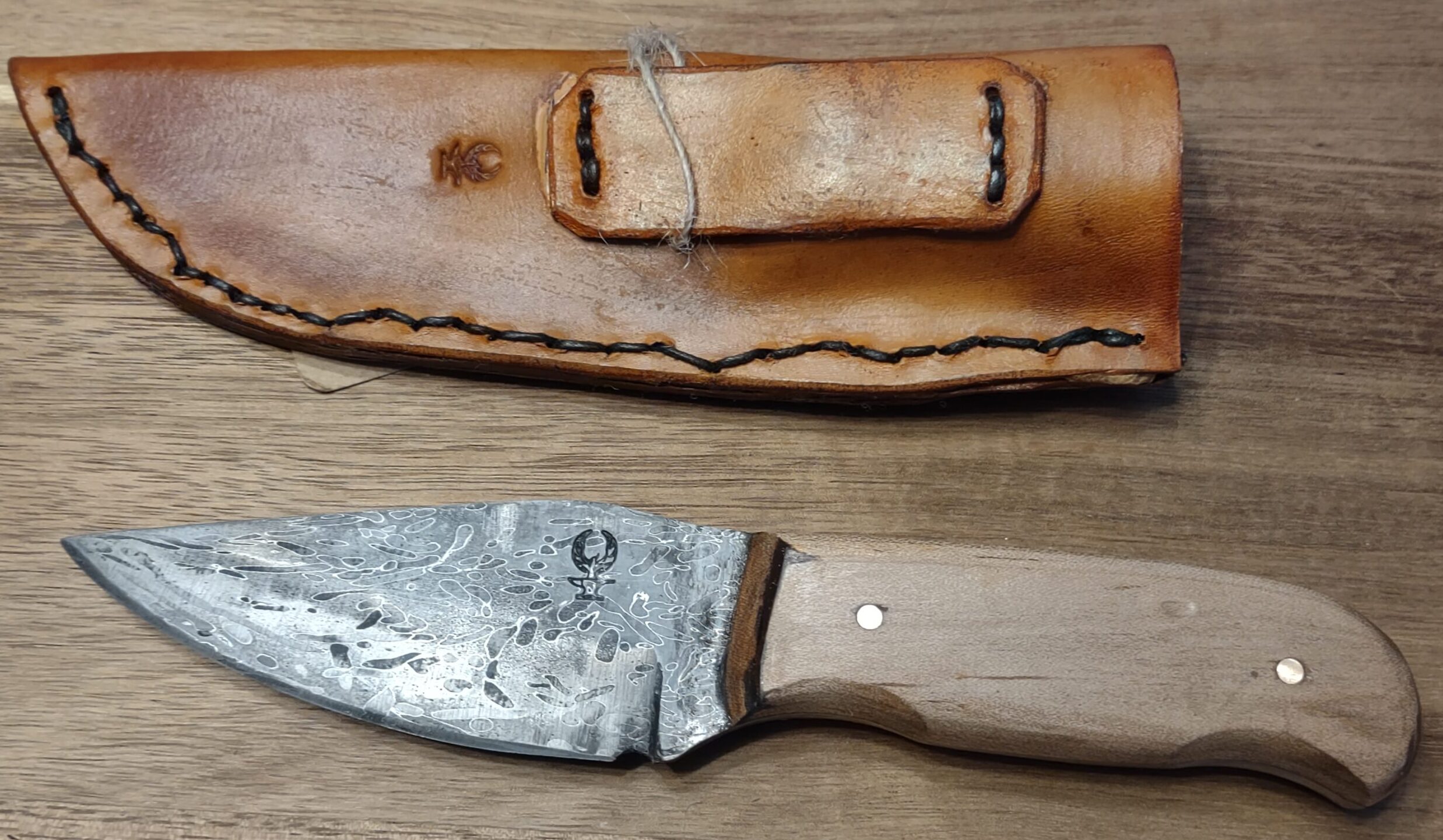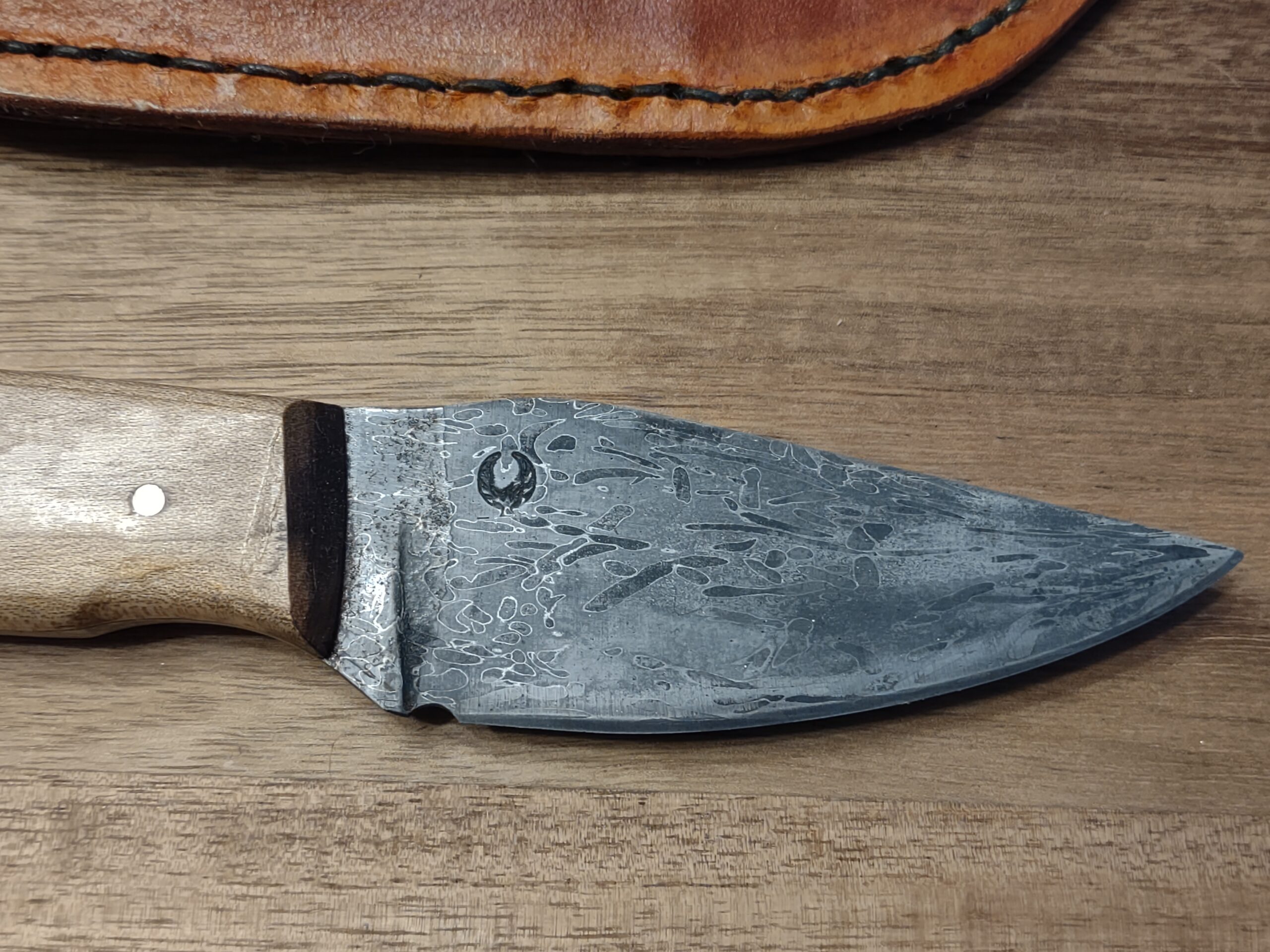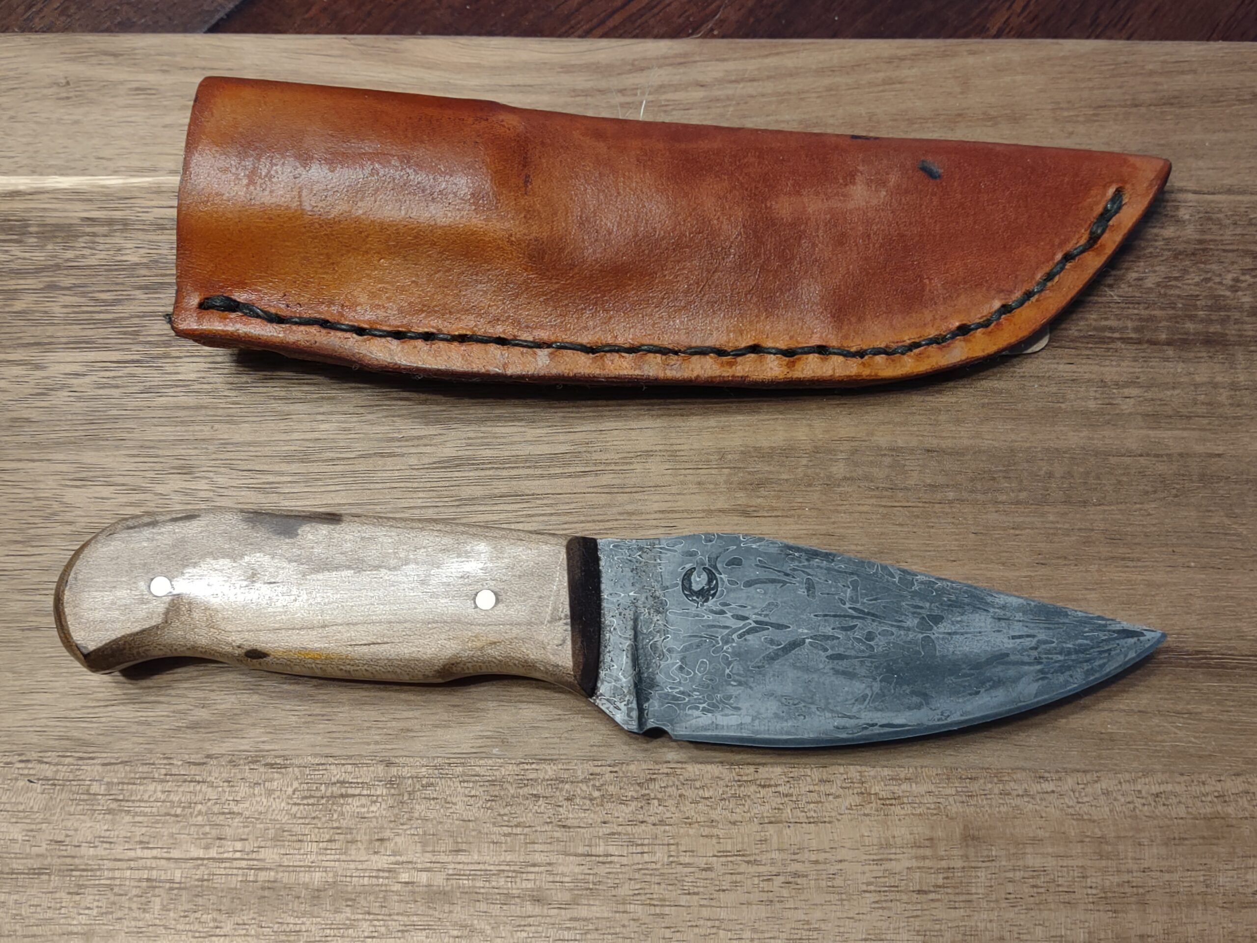 Finished with beautifully crafted maple wood handles, the knife offers a warm, natural feel in hand. It comes complete with a custom handmade leather sheath, stitched and shaped for secure everyday carry.